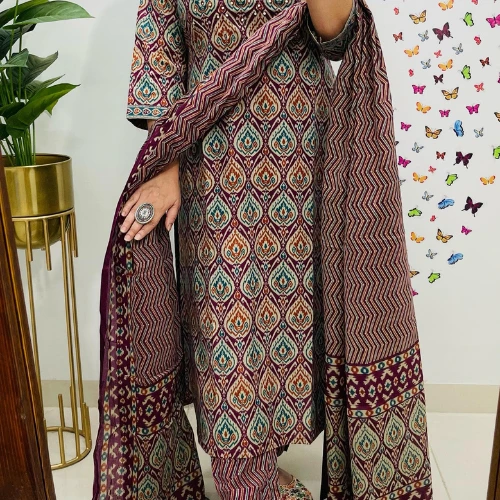 Designer Azrak Print Cotton SuitDesigner Suit in Azrak/Mughal/Kalamkari Fusion Azrak bagru print kurti pant dupatta set Premium fine cotton with handcrafted work on yoke paired with fine dupatta with tassels on dupatta....