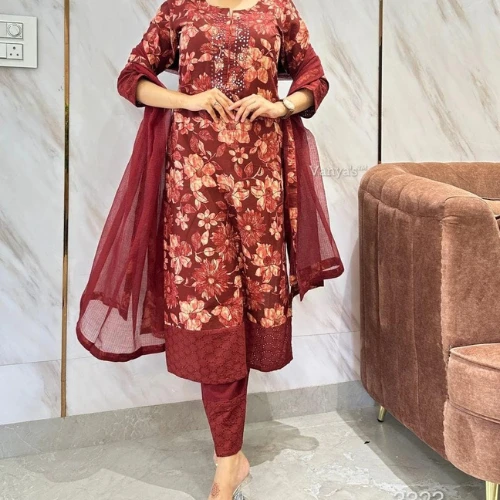 Explore this pure cotton floral printed and rust red suit, enclosed with chicken schiffl lace work over kurta and cotton pant, paired with pure cotton thread kota doria duppata❤❤