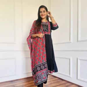 Premium cotton 3 pc suit set with Aline kurti embellishment with mirror work and print detailing…