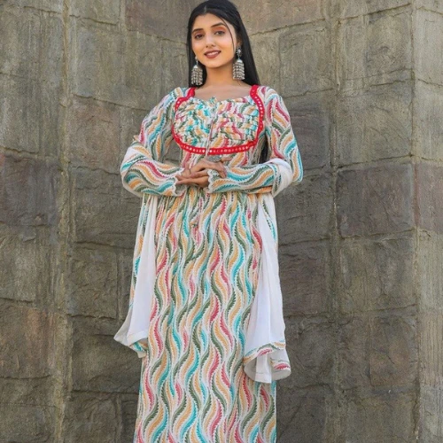 Featuring soothing yet😍 cinnon print and full lining with printed pent and ciffon dupatta with printed lace 😘elegant printing 😍Anarkali gown with Color. Maltiprint and pettern. It is a perfect outfit for any small gathering or function. It is very comfortable as it looks