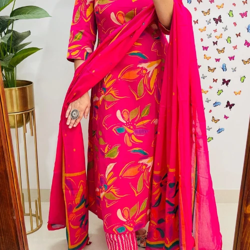 Designer Suit in Azrak/Mughal/Kalamkari Fusion Azrak bagru print kurti pant dupatta set Premium fine cotton with handcrafted work on yoke paired with fine dupatta with tassels on dupatta....