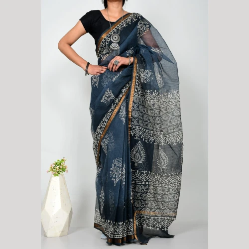Hand Block Printed Pure Kota Doria Saree with Blouse Piece.